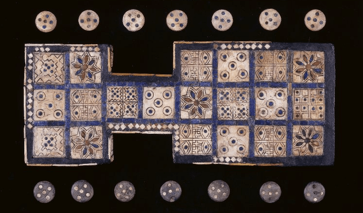 A transição dos ossos orgânicos para objetos geometricamente definidos foi um passo crucial. Uma das evidências mais antigas de dados manufaturados vem da Mesopotâmia. Escavações na cidade-estado de Ur (atual Iraque) revelaram o “Jogo Real de Ur”, um dos jogos de tabuleiro mais antigos já descobertos, datado de cerca de 2600 a.C. Junto ao tabuleiro, foram encontrados dados tetraédricos (com quatro faces), os ancestrais diretos do nosso querido d4 de RPG!